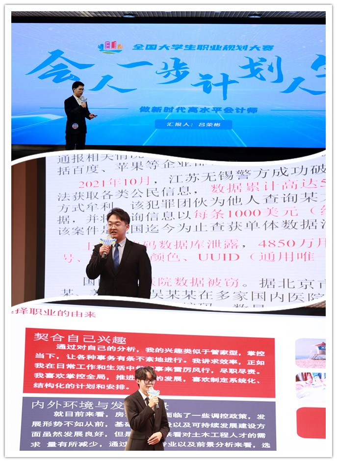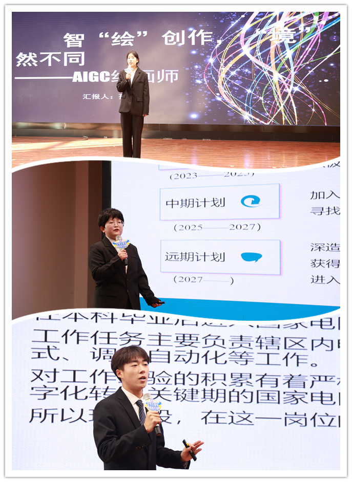 决赛共分为生涯发展报告/求职简历展示、8/7分钟PPT自我陈述和现场答辩三个环节。评委老师结合选手综合表现点评打分,使每位选手对自己的职业规划和就业方向有了更清晰更深入的认知。最终,成长赛道管理学院税收21-3班吕荣彬获得一等奖,电子与信息工程学院电信21-3班高亮和建筑工程学院土木22-2班夏睿获得二等奖,计算机与信息工程学院计科21-3班孙榕婧、环境与化工学院张馨丹、电气与控制工程学院电气23-9班刘哲宇获得三等奖;就业赛道人文社会科学学院汉语言20-2班景韬颖、计算机与信息工程学院数据20-2班刘长奇获一等奖,计算机与信息工程学院计科20-1班陈浩、管理学院数管21-3班王鹤怡、研究生学院研23-14班苏雨馨获得二等奖,马克思学院思政21-2班宋博昌、电子与信息工程学院通信20-1班沈中昊、研究生学院研23-13班蒲禹含获得三等奖。管理学院李丽娜、人文与社会科学学院张利南、电子与信息工程学院刘赢等16名老师荣获优秀指导教师奖。建筑工程学院、管理学院、环境与化工学院、人文与社会科学学院荣获优秀组织奖。省人力资源服务业协会副秘书长徐波对大赛进行了精彩点评。