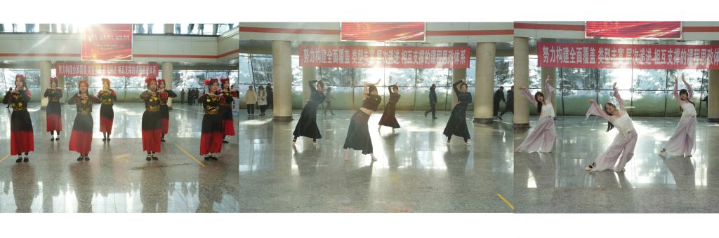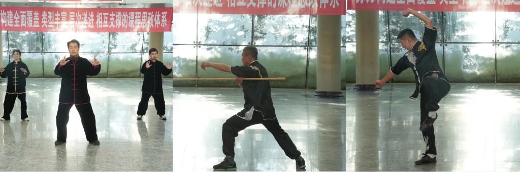首先,进行的是中华武术及民族舞蹈表演。体育部教师王锐、陈鑫朋、王焕利为在场师生展示中华传统武术项目,太极拳、棍术和长拳。由体育部教师冯宇、孙佳剑、刘聪指导的学生表演了新疆舞、傣族舞以及舞蹈“民族之花”,精彩的表演充分展现了中华传统体育的力与美,博得了在场师生的阵阵掌声。