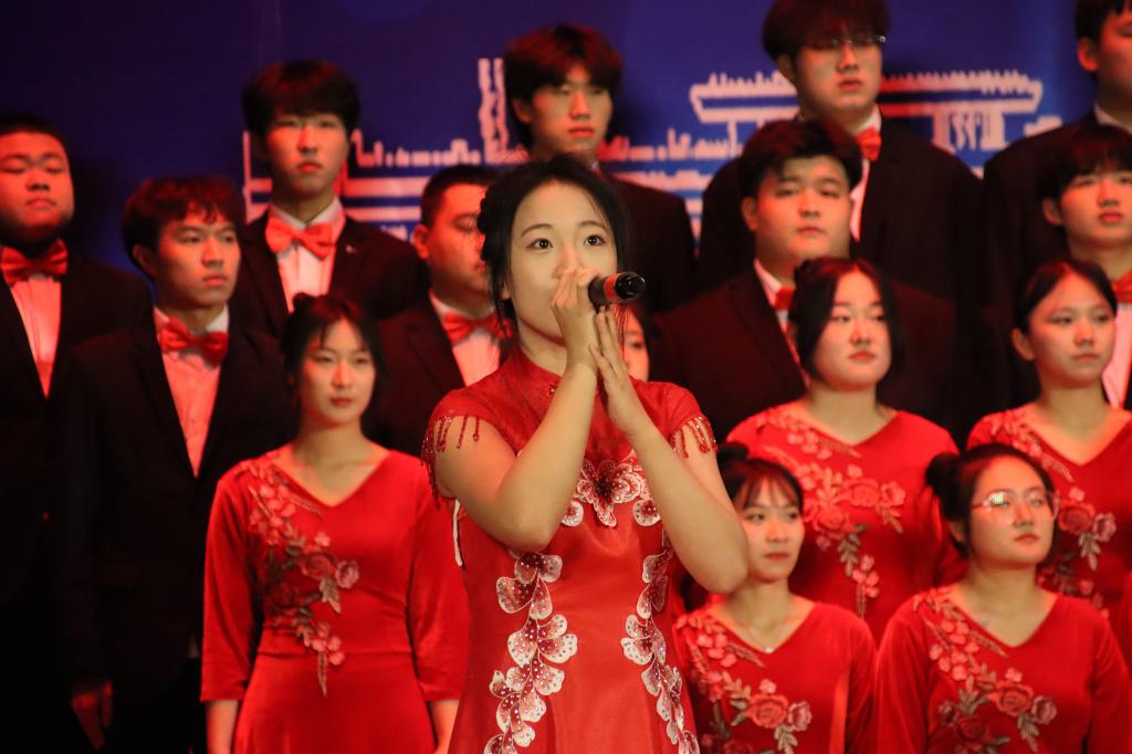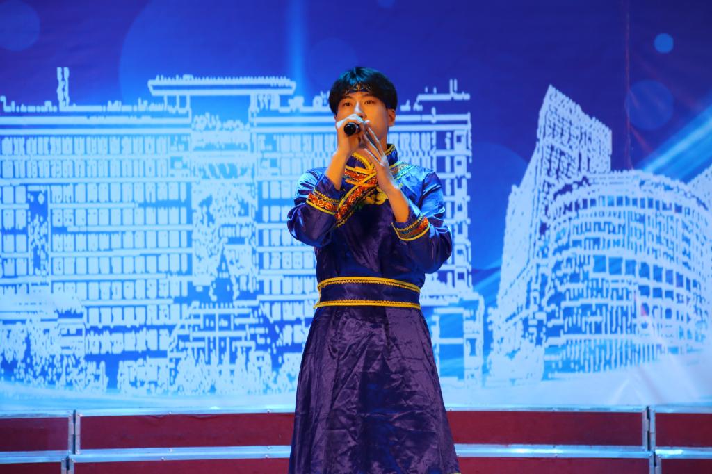 大学生合唱团表演的合唱《映山红》《军民团结一家亲》情真意切、旋律优美,表达了“民拥军意泰山重、军爱民情东海深”的强烈情感。经济学院国贸21-2班钟云轩、马克思学院思政23-1班柯孟圻表演歌舞《乌兰巴托的夜》,曲调悠扬婉转、舞姿优美动人,展现了“红色英雄城”乌兰巴托的静谧与美丽。安全学院安全21-4班王木子和大学生凤凰鸟艺术团的同学们带来歌舞《幸福山歌》,高亢嘹亮的嗓音、欢快的舞蹈,带领观众深切感受到祖国的繁荣昌盛,以及身为华夏儿女的幸福。