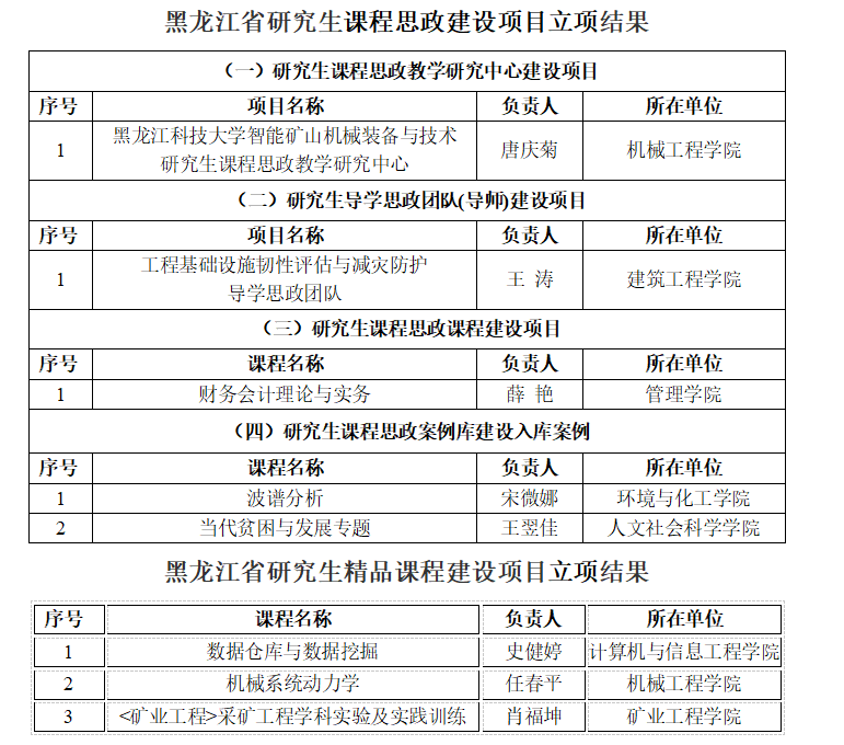近日,黑龙江省教育厅下发了《黑龙江省教育厅关于公布2023年度研究生精品课程建设项目立项结果的通知》和《黑龙江省教育厅关于公布2023年度研究生课程思政建设项目立项结果的通知》,【官网】获批立项建设黑龙江省研究生课程思政教学研究中心1个、导学思政团队(导师)1个、课程思政课程1门、课程思政案例2项、研究生精品课程3门。