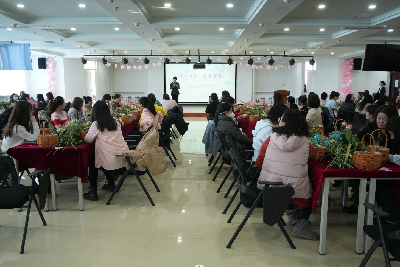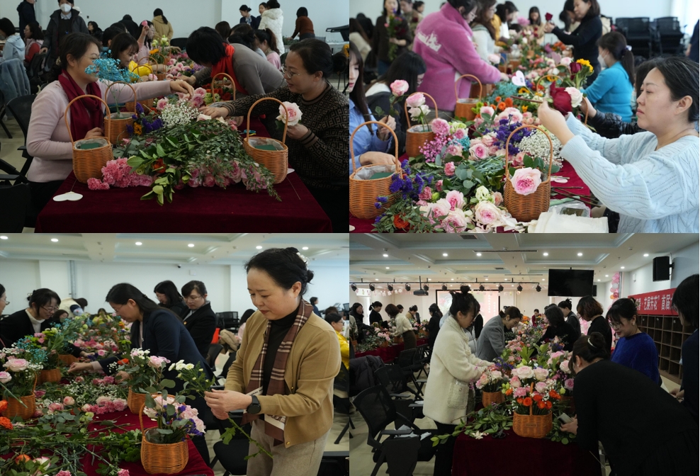 活动现场,女教职工们认真聆听了插花知识小讲座,边学习边实践,充分发挥想象力和创造力,剪枝叶、搭色彩、设计造型,将一株株娇艳欲滴的玫瑰、亲切暖人的康乃馨、向往光明的太阳花等鲜花,通过精心设计创造完成一个个馥郁芬芳的花篮,大家尽情享受着亲手创作的乐趣和插花艺术带来的美好体验,沉浸在创作和欣赏之中,静待这支专属于自己的幸福之花慢慢绽放。