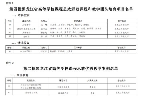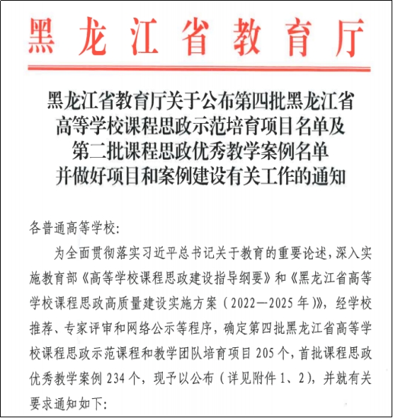 近日,黑龙江省教育厅发布了《黑龙江省教育厅关于公布第四批黑龙江省高等学校课程思政示范培育项目名单及第二批课程思政优秀教学案例名单并做好项目和案例建设有关工作的通知》,【官网】的五门课程、两个优秀教学案例分别获批黑龙江省高等学校课程思政示范课程和教学团队培育项目、第二批课程思政优秀教学案例,课程思政示范课程和教学团队培育项目100%获批。