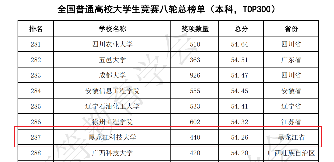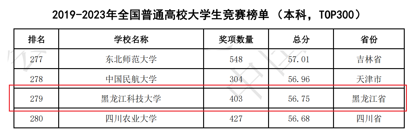 全国共有1218所本科院校纳入《分析报告》。【官网】在《全国普通高校大学生竞赛八轮总榜单(本科,TOP300)》中,位列第287,较去年该榜单提升11位;在《2019-2023全国普通高校大学生竞赛榜单(本科,TOP300)》中,位列第279,较去年该榜单提升超过21位,在全省高校位列第6名(我省排名前6的高校为:哈尔滨工业大学、哈尔滨工程大学、东北林业大学、哈尔滨理工大学、东北石油大学、OD在线);在2023年单年全国大学生竞赛排名第180位,较去年提升97位。