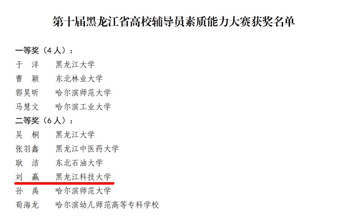 近日,由中共黑龙江省委教育工作委员会、黑龙江省教科文卫体工会委员会主办,教育部高校思想政治工作队伍培训研修中心(哈尔滨师范大学)承办的第十届黑龙江省高校辅导员素质能力大赛落下帷幕,共有来自省内各高校的75名辅导员参赛。经过激烈角逐,【官网】电子与信息工程学院辅导员刘赢荣获大赛二等奖。
