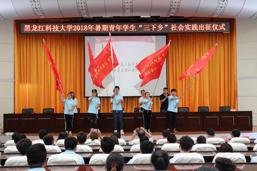 校团委副书记苗雨对2018年暑期青年学生“三下乡”社会实践筹备情况进行介绍并作以部署,与重点实践团队指导教师代表签订责任状。建筑工程学院团委组建的“服务乡村振兴·建设大美嫩江”赴嫩江市九三农场调研团、校青年志愿者协会组建的“弄潮创青春·奉献新时代” 赴北京华为L02展厅、北京理工大学生调研团做了实践前筹备报告;2018年国家专项天翼“互联网+”教育走进伊春金山屯教育关爱社会实践团团长——外国语学院英语16-1班李妍曼同学代表社会实践服务团的全体成员作表态发言。与会领导向“三下乡”社会实践重点团队授旗。