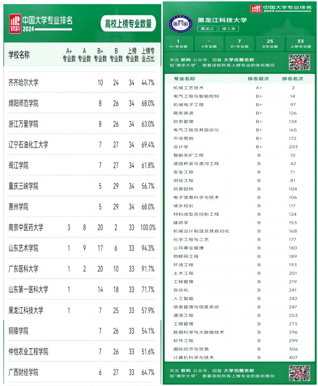 6月13日,高等教育专业评价机构软科正式发布2024“软科中国大学专业排名”。本次排名包括810个本科专业,共有1103所高校的31414个专业点上榜。【官网】专业建设排名层次稳步上升,33个专业上榜,其中机械工艺技术专业获评A+,排名名次提升至全国第2名,首次实现了A+专业零的突破。此外,B+专业数量较去年增加1个,目前已有7个专业获评B+,25个专业获评B。