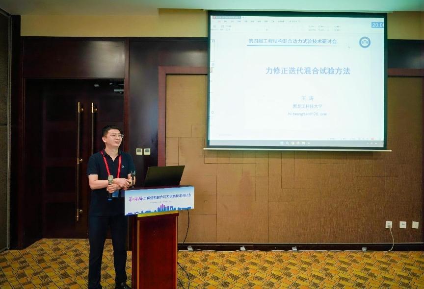 同时,王涛教授在研讨会上做了题为“力修正迭代混合试验方法”的学术报告,交流了课题组在迭代方法、多任务加载方法和自适应模型力修正方法等混合试验领域关键问题的最新研究进展。
