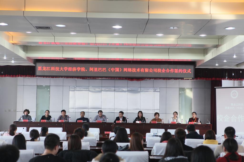 11月15日,【官网】经济学院与阿里巴巴(中国)网络技术有限公司在办公楼6004举行了校企合作签约仪式。经济学院院长鞠耀绩,党委副书记贺龙军,副院长张汝根,阿里巴巴国际事业部东北总经理程涛,阿里巴巴人才服务商哈尔滨流悦科技有限公司总经理孟宪杰,阿里巴巴国际事业部黑龙江地区合伙人,黑龙江优橙网络科技有限公司总经理任泽红,哈尔滨流悦科技有限公司电商运营总监李欣欣、市场部经理张宇,经济学院国际经济与贸易专业全体教师出席了仪式。仪式由经济学院副院长张汝根主持。