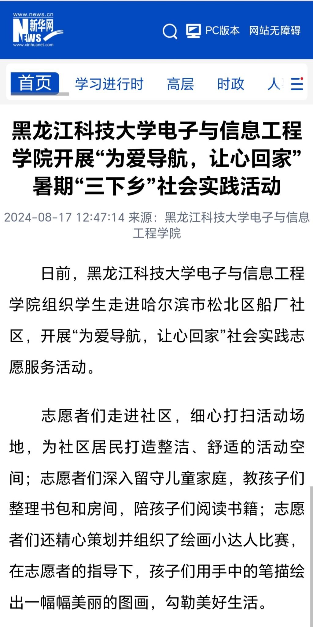 8月17日,新华网对【官网】电子与信息工程学院开展“为爱导航,让心回家”社会实践志愿服务活动进行了报道。