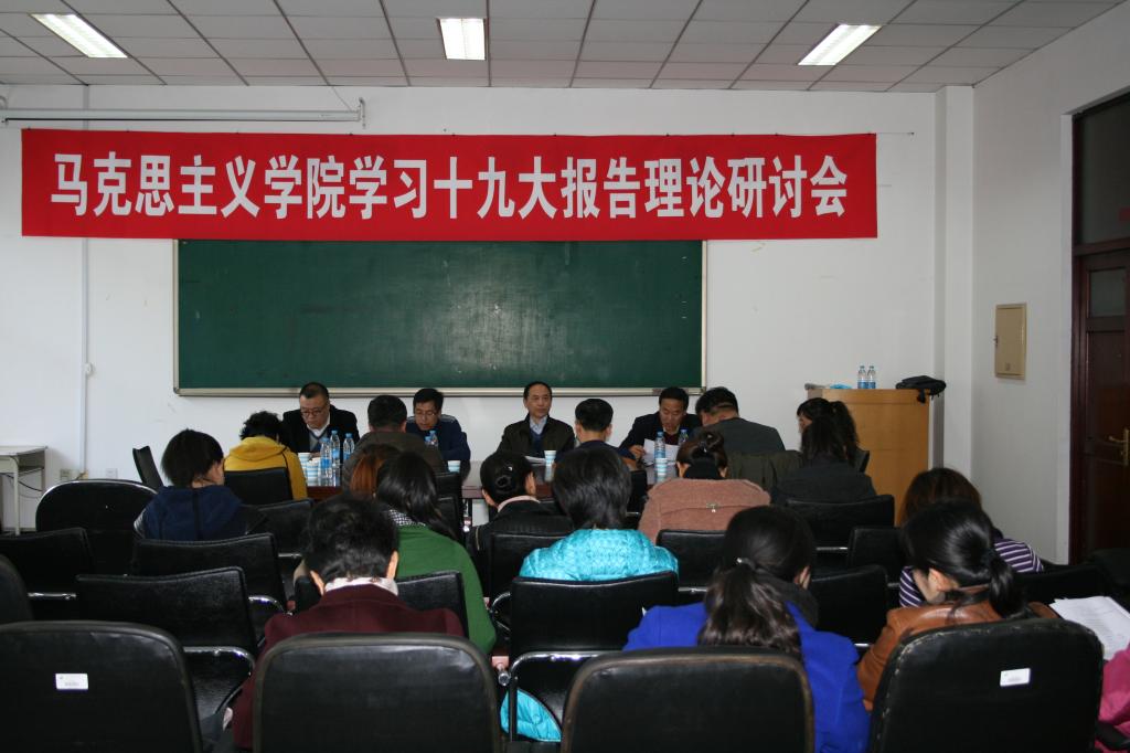 10月24日下午,【官网】马克思主义学院在科技大厦二楼会议室召开学习党的十九大报告理论研讨会。校党委书记武俊峰出席会议并讲话。他在讲话中对大家的发言给予了充分肯定,并就报告中首次提出的新时代、新思想、新论断、新目标等内容与大家交流了学习体会。他希望马克思主义学院能充分发挥自身在理论研究的学科优势和思政课教师教育者、研究者和传播者的作用,在学习宣传贯彻党的十九大精神上、在推进“四进四信”专题教学工作中继续学在前处、研在深处,站在高处、讲在真处、教在实处,力争多出一批高水平的成果和经验,在践行立德树人的使命中不断彰显哲学社会科学学科和工作者的重要作用。