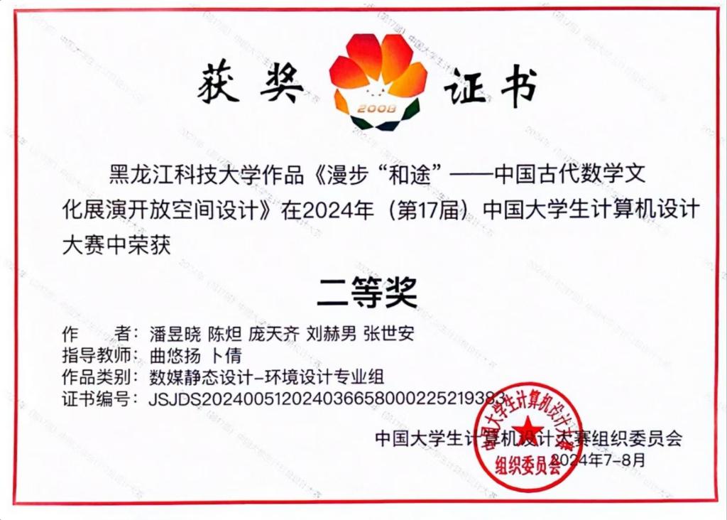 建筑工程学院教师曲悠扬、卜倩指导的城乡规划专业学生潘昱晓、陈炟、刘赫男、张世安,风景园林专业学生庞天齐组成的团队完成的作品“漫步‘和途’——中国古代数学文化展演开放空间设计”经过校赛和省赛的层层筛选,团队成功晋级国家级比赛。在国家级线下比赛答辩过程中,团队展示了四张A3展板作品,通过作品视频详细呈现了项目内容,并对设计作品进行了汇报;此外,团队还制作了作品宣传册、设计模型及线上导览二维码,高质量完成了参赛作品的展示。经过努力,参赛团队在国赛中获得二等奖。