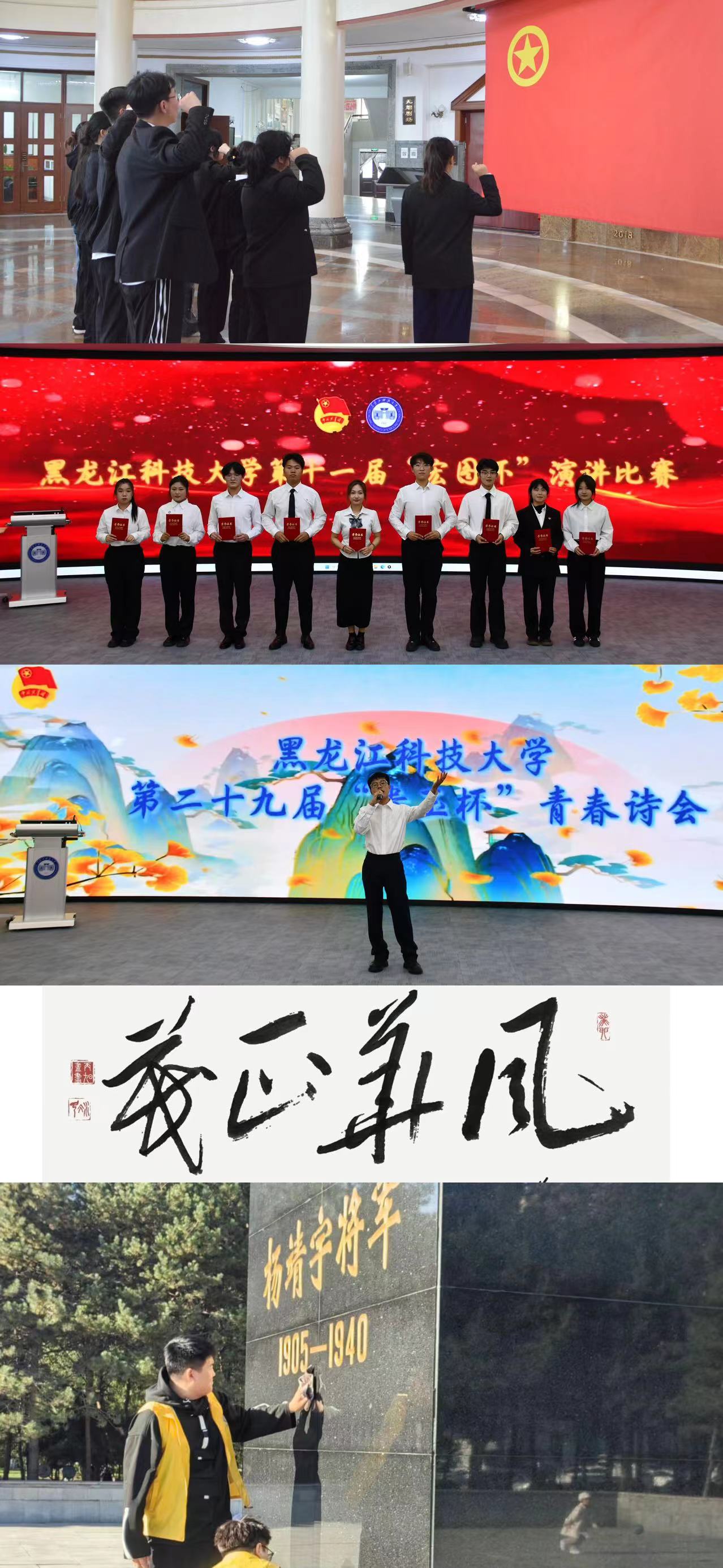 以信力行,在躬耕实践中增添亮色。校团委依托太阳石文学社、演讲与辩论协会组织开展第二十九届“贵玉杯”青春诗会、第十一届“宏图杯”演讲比赛,青年学生用诗篇歌颂祖国的荣光,践行责任担当。环化学院团委、材料学院团委、外国语学院团委开展了红色歌曲传唱活动。建工学院团委、材料学院团委组织开展“寻找身边的红”打卡红色地标活动。人文学院团委、外国语学院团委组织开展了“丹青绘盛世,翰墨颂华章”书法作品比赛,让传统文化在青年学生的笔尖中焕发光彩。校青年志愿者协会、马克思学院团委组织青年学生分别赴靖宇公园、哈尔滨青年运动史纪念馆开展实践活动,在擦拭纪念碑、重温入团誓词中深刻缅怀革命先辈,传承红色精神。