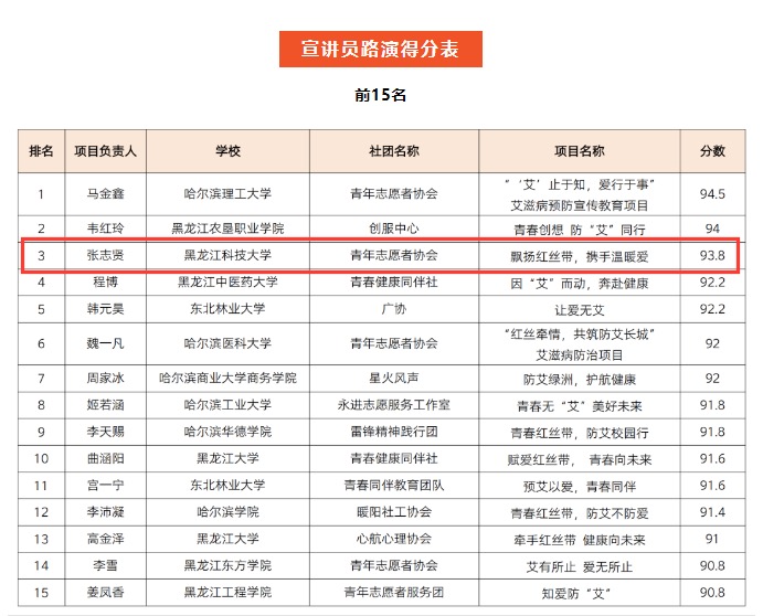 自2024年第三届哈尔滨大学生社团健康红丝带行动计划启动以来,校青年志愿者协会青春健康同伴社积极组织项目策划与申报,项目组经过多轮项目修改,最终确定了项目方案。经评审,【官网】“飘扬红丝带,携手温暖爱”项目脱颖而出,获得立项资格。在宣讲员路演会上,宣讲员以饱满的热情和专业的态度,向评委和观众展示了项目的亮点与特色,经过三个多小时的激烈角逐,以第三名的优秀成绩成功入选示范项目并签订了项目实施委托协议。