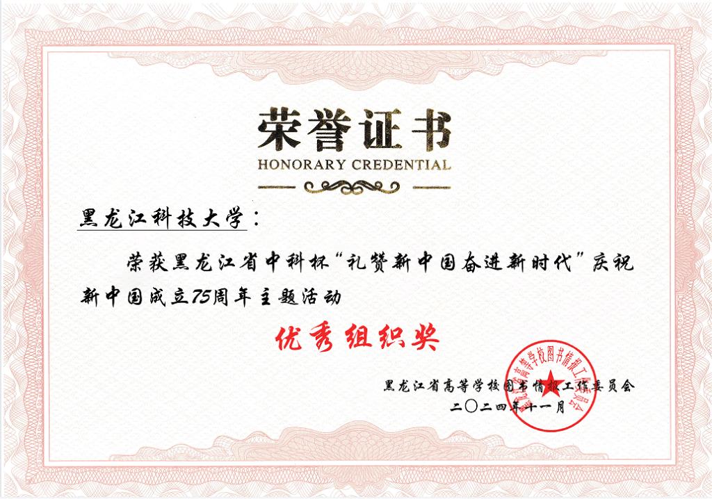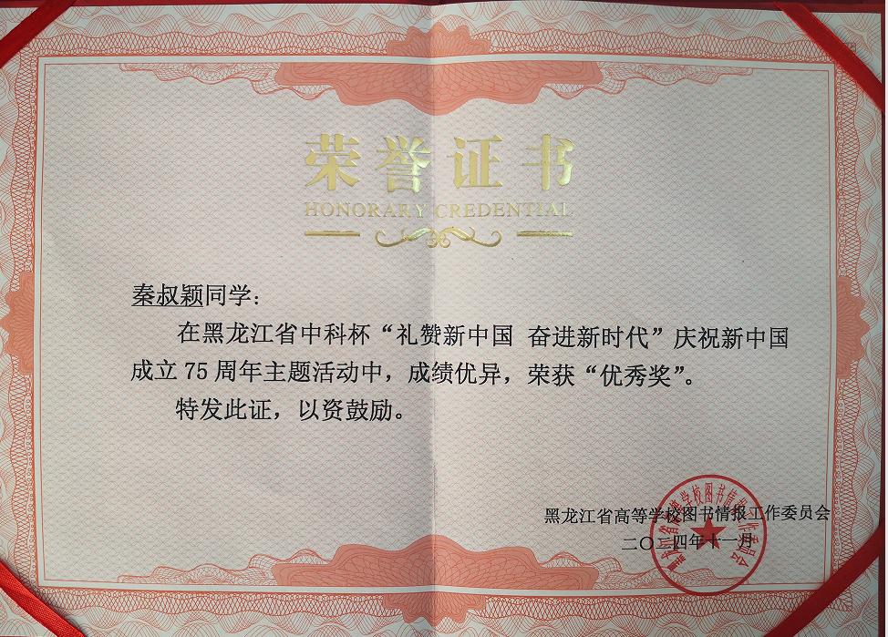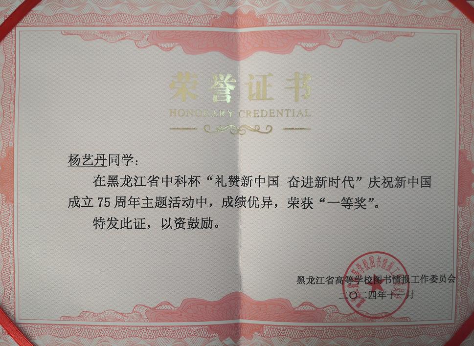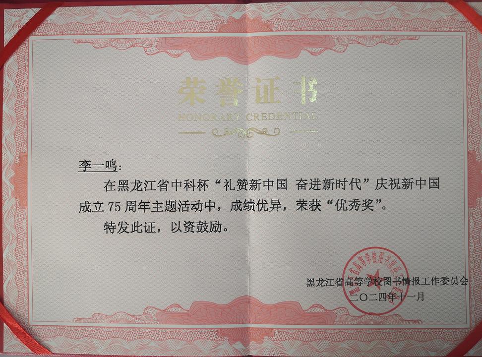 近日,由黑龙江省高等学校图书情报工作委员会主办,中科软股教育科技(北京)股份有限公司协办的黑龙江省中科杯“礼赞新中国 奋进新时代”庆祝新中国成立75周年主题活动获奖名单公布。【官网】研究生学院杨艺丹获学生组一等奖、环境与化工学院秦叔颖获学生组优秀奖,李一鸣获教师组优秀奖,学校获得优秀组织奖。