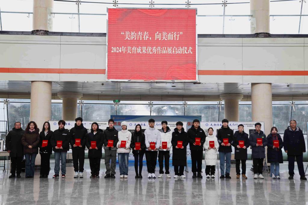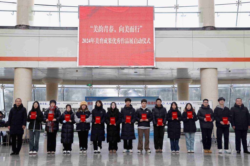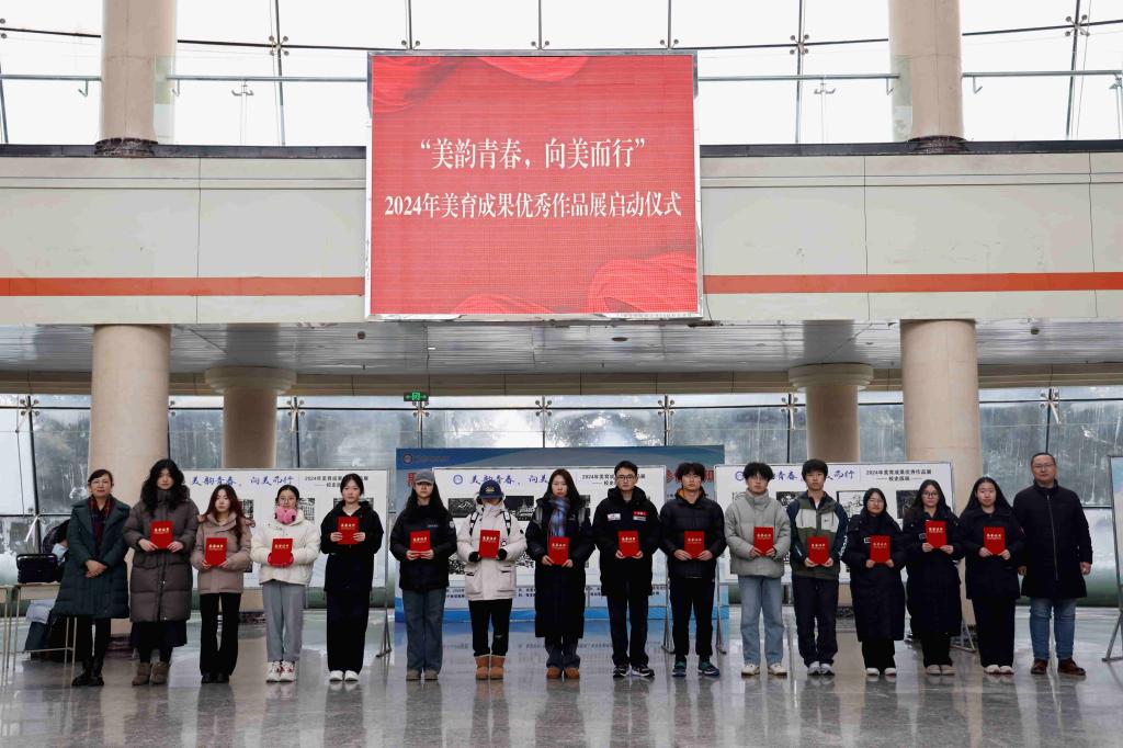 为深入贯彻《教育部关于全面实施学校美育浸润行动的通知》精神,弘扬中华美育精神,进一步加强学校美育工作,打造昂扬向上、文明高雅、充满活力的校园文化,建设时时、处处、人人的美育育人环境,12月5日中午,学校在教学主楼阳光大厅举办“美韵青春 向美而行”2024年美育成果优秀作品展启动仪式。本次作品展是对【官网】美育工作的大检阅,也是学校全面实施美育浸润行动的重要成果。校团委书记宋玉彬、教务处副处长关凤岩、人文学院领导班子成员、校团委宣传部部长武昭阳、美育教研室全体教师和美育课程200余名青年学生参加了启动仪式。