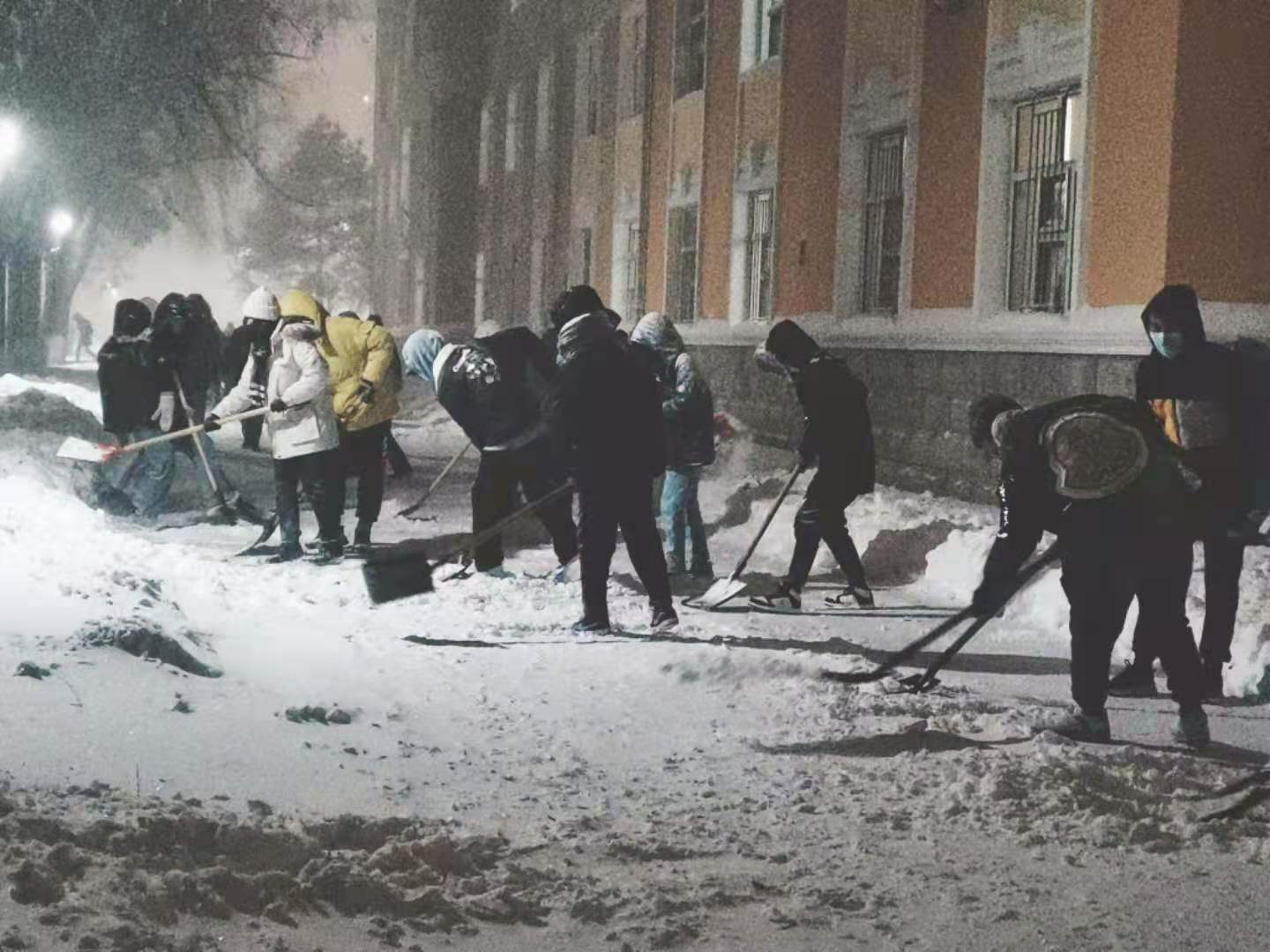 学生夜晚扫雪现场