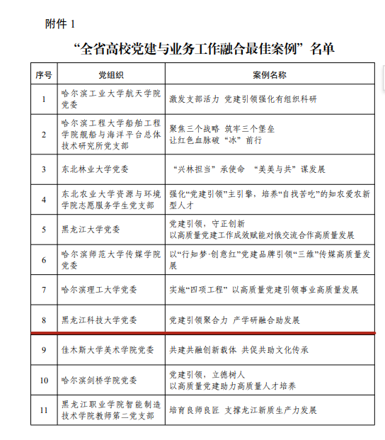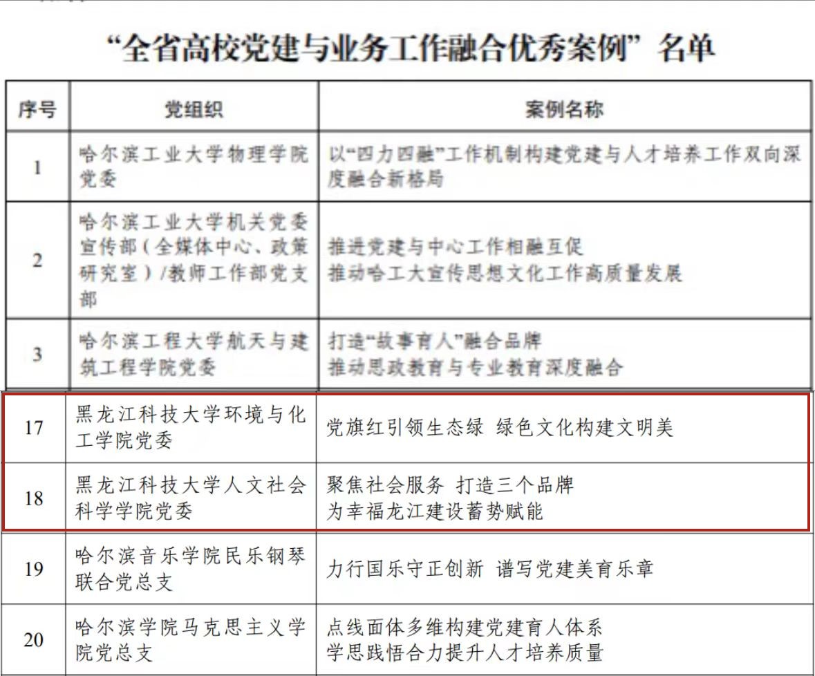 近日,黑龙江省委教育工委组织开展全省高校党建与业务工作融合案例评选,经高校党委推荐、省内外专家评审,【官网】报送的3个案例获奖。其中学校党委《党建引领聚合力产学研融合助发展》获评最佳案例,环境与化工学院党委《党旗红引领生态绿绿色文化构建文明美》、人文社会科学学院党委《聚焦社会服务打造三个品牌为幸福龙江建设蓄势赋能》获评优秀案例。
