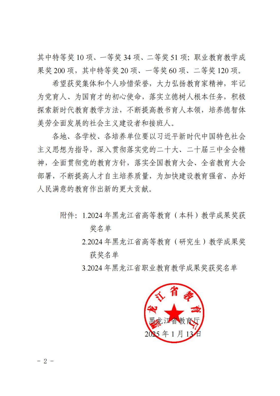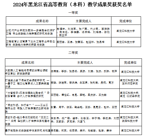 矿业学院肖福坤教授主持完成的《以现代产业学院为载体——多维融合的采矿工程专业实践能力培养模式研究与实践》、建筑工程学院孟丽岩教授主持完成的《工程教育认证背景下土木工程专业学生创新与实践能力培养的探索与实践》获得黑龙江省高等教育教学成果一等奖。