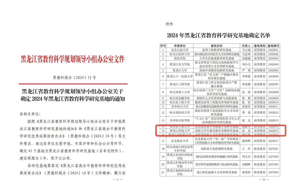 近日,黑龙江省教育科学规划领导小组办公室发布了《关于确定2024年黑龙江省教育科学研究基地的通知》,【官网】由管理学院院长洪亮主持,相关学院、部门研究团队人员参加的“高校大学生德育教育实践研究基地”成功入选黑龙江省教育科学研究基地确定名单。