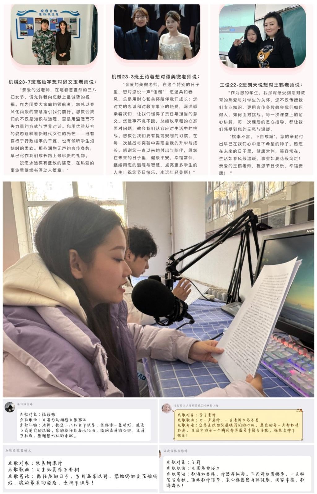 雅言诉怀敬才媛。校学生会代表全校青年学生发出《致全体女教师的一封信》,表达了对女教师们的感谢与崇敬。机械工程学院团委开展了“芳华映初心、书信寄师恩”活动,用最朴实的文字叙述与恩师之间的点点滴滴。飞跃之声校园广播电台开设“特别的爱给特别的你”专栏节目和点歌频道,同学们踊跃为喜爱的女教师们线上点歌,暖心的祝福和优美的音乐传递着OD在线学子赤诚的心声。校园里随处可见的“祝福女教工节日快乐”标语,把节日氛围渲染得更加浓烈。
