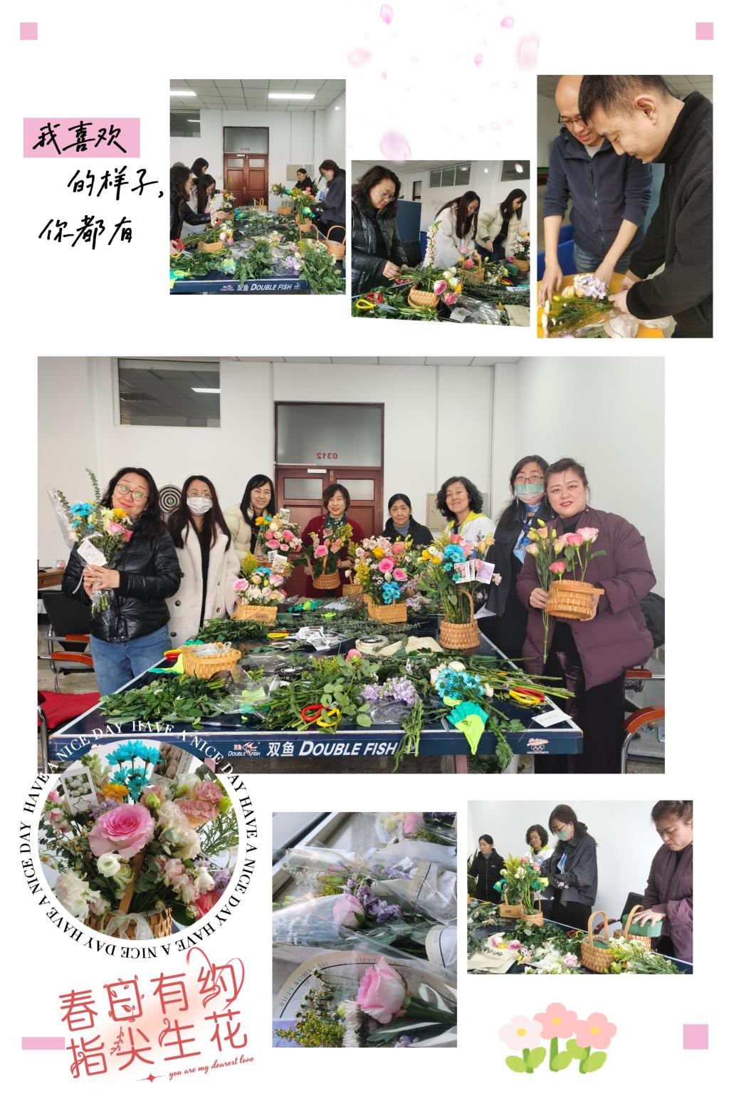 信息网络中心工会为全体职工举办了“春日有约·指尖生花”插花活动。早春的室外春寒料峭,活动现场却花团锦簇、芳香四溢,女职工们选择花材、搭配色彩,边学边做,交流切磋,并发挥创造力制作出一个个精美的插花作品;男职工们则学习小花束的制作方法,送给最重要的人,参加活动的职工脸上都洋溢着幸福感和成就感,大家度过了一个有特色、有温度的节日。