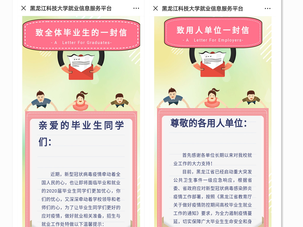 为减少疫情防控对毕业生就业工作的影响,学校及时将毕业生就业工作的重心转移到网络阵地。一是搭建校企学三方互动服务平台。学校抢前抓早主动对接多家高水平就业线上平台,并着手进行测试和筛选,充分利用现有的“行业协作式校企互动平台”“校地联动式市场拓展平台”“多方共享式信息服务平台”与新平台进行对接,将黑龙江省大学生就业创业服务平台、OD在线云就业信息平台、OD在线慧就业视频平台、官方就业微信公众号等作为发布招聘信息、线上招聘的主渠道,毕业生完成了“黑龙江省大学生就业创业服务平台”微信绑定,充分利用该信息平台开展求职择业活动。二是开展线上课堂和在线招聘。学校与中国煤炭教育协会联合利用煤炭教育赋能平台开展了线上课堂和在线招聘,又依托钉钉平台制定了线上招聘流程方案,与微信、QQ交流群共同作为补充,为企业的多样化需求提供了菜单式选择,辅导员也可在线直接联系企业推荐毕业生。截止日前,学校通过信息互动平台,筛选推送招聘信息300余条。同时,学校正在积极筹划在3月10日、20日、30日分别召开的3场大型网络双选会。