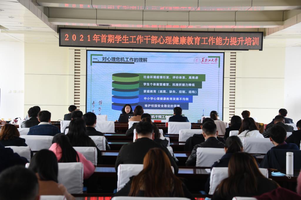 为进一步提高【官网】学生心理健康教育工作水平,提升学生工作队伍专业能力素质,强化学生工作干部心理危机干预的辨识能力,推动学生工作干部职业化、专业化水平,3月30日,学工部在信息楼6004会议室举办了2021年首期学生工作干部心理健康教育工作能力培训会,各学院主管学生工作副书记、全体辅导员、大学生心理健康辅导中心全体成员参加了培训会,培训会由学工部部长、学生处处长邬承斌主持。