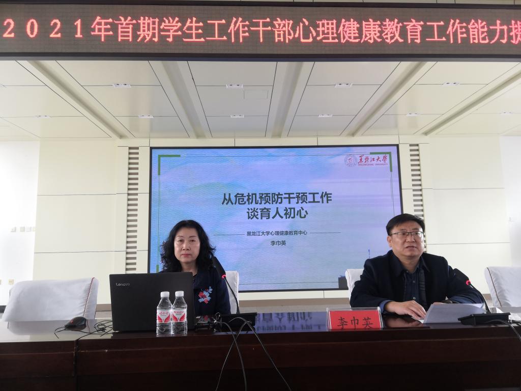 本次培训会采用线下与线上相结合的方式,上午邀请了黑龙江省高校心理健康教育专家指导委员会秘书长、黑龙江大学学生工作部副部长、心理健康教育中心主任李巾英,为全体学生工作干部作了《从危机预防干预工作谈育人初心》线下专题讲座。她从对心理危机工作的理解、心理危机预防工作环节、心理危机预防工作瓶颈突破三个方面入手,系统介绍了高校心理危机干预工作面临的新挑战、重点关注学生的等级分类和评估干预过程、干预过程中的工作困难和化解、辅导员危机状态下的心理反应和调试等方面的内容。本次讲座使全体学生工作干部明确了“四级”预警防控体系的工作流程;明确了学生工作干部危机干预具体应对策略;明确了危机干预时如何开展学校家庭社会协同育人机制的方式方法。