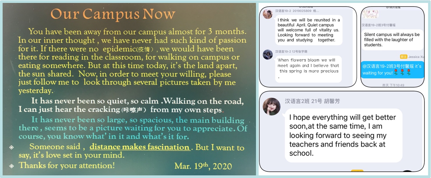 1.公外教师潜心线上教学,教学内容丰富有新意。受疫情影响,按各学院需求,外国语学院在教务处的指导下,调整了部分公共外语的教学计划,推敲研判确定大学外语QQ、MOOC和Welearn线上平台三维空间教室。各位教研室主任们组成团队,率先进行技术学习,模拟课堂,演练网络授课。教师通过观摩教研室主任在平台示范演练后,分组进行操作实践。教师们反复实践,测试、推敲网络教学内容,充分将“应用型人才培养”的元素纳入教学计划,设计出了符合【官网】教学实际的在线课程教学方案,为教学工作顺利开展奠定了基础。教师们利用网络,发挥集体备课优势,每周的视频教研活动规范有内容,分享有新意。教学内容既有“规定动作”,又有“自选动作”,既有“文化传承教育”,又有“时事英语交流”。徐亚辉教授利用课前10分钟学生口语讲练活动,把近日校园照片推送给学生并进行了描述,把师生对返回校园的渴望和对学校的热爱用英语做了真情表达,进一步激发了学生爱校如家的情怀。
