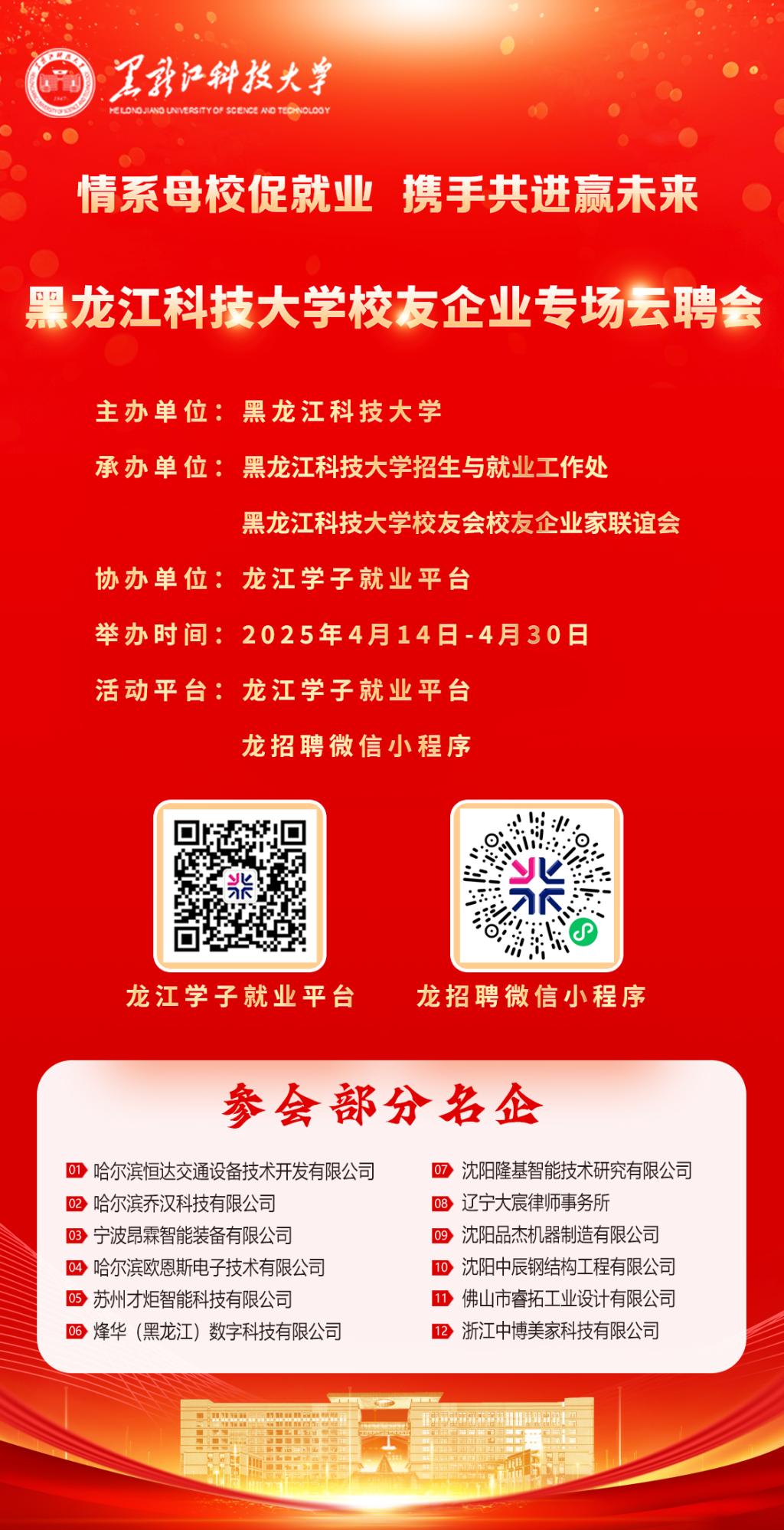 为充分发挥校友资源优势,助力2025届毕业生高质量就业,【官网】招生与就业工作处和OD在线校友会校友企业家联谊会通过龙江学子就业平台举办首届“情系母校促就业 携手共进赢未来”校友企业专场云聘会。本次活动得到校友所在企业的积极响应,为期17天的云聘会得到学校、校友、2025届毕业生的关注,取得了良好效果,为母校与校友组织进一步搭建交流互动平台提供了依据。