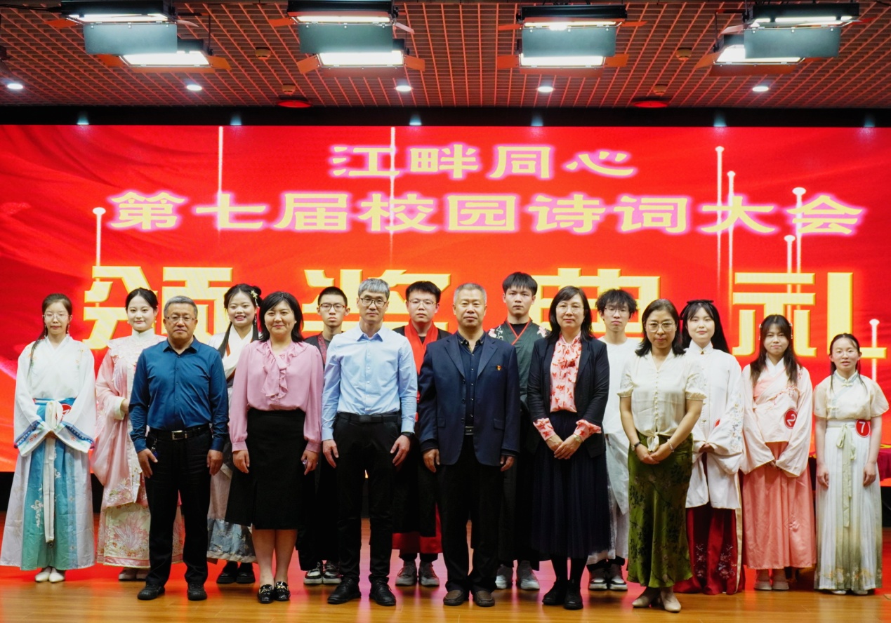 为赓续中华文脉、厚植文化底蕴,深化营造书香校园诗意氛围,引领广大师生品读古典韵律、体悟千年哲思,5月29日晚,由党委宣传统战部、校团委、图书馆联合主办的“江畔同心”第七届校园诗词大会决赛在朝阳楼报告厅璀璨启幕。党委宣传统战部副部长吴维华,校团委副书记马紫微,图书馆馆长郭明良、副馆长李强出席了当晚决赛。人文社会科学学院曹景萍教授、李璐副教授担任点评嘉宾。本场决赛由吴南主持,来自图书馆和各学院的百余名师生共同观看了这场诗词盛会。
