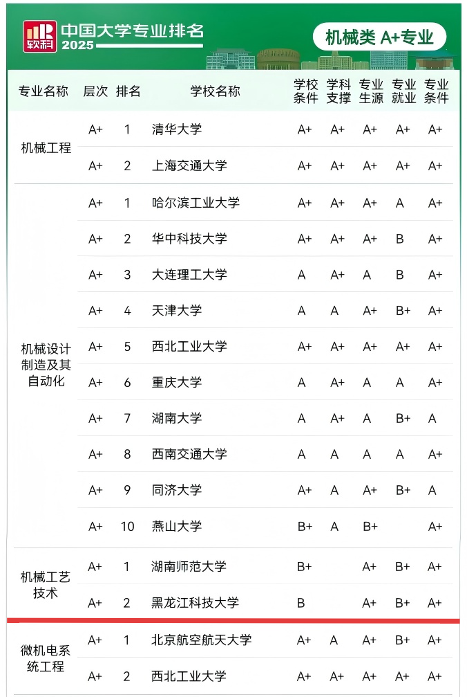 近日,“2025软科中国大学专业排名”正式发布,机械工程学院机械工艺技术专业继2024年首次获评A+后,2025年再次荣登A+行列,继续排名全国第二。连续两年蝉联该评级,充分彰显了【官网】机械类专业在国内的较高地位和持续发展实力。