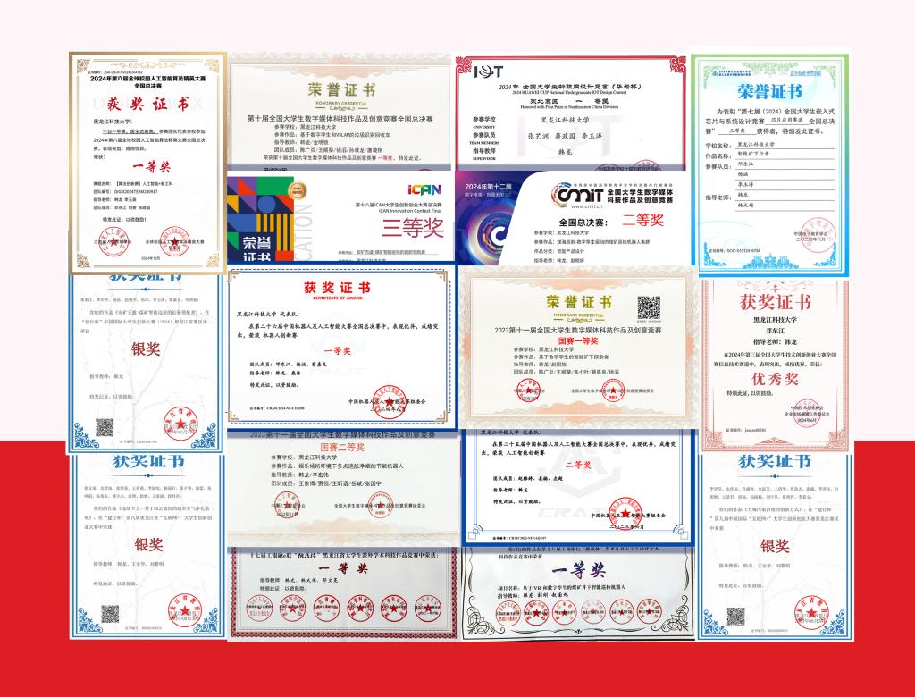 由电气、机械、计算机、矿业工程、控制工程等多学科学生组成的“科创尖刀连”,在各类赛事中展现出强劲实力。2014年至2024年间,他们捧回16项国家级奖项、69项省级奖项——在全球校园人工智能算法精英大赛中,“智能矿下行者”项目用深度学习破解煤矿瓦斯预警难题;中国机器人及人工智能大赛上,“数字孪生驱动的探矿巡检机器人集群”项目获得评委高度评价。这些荣誉的背后,是师生们在备赛期的日夜鏖战。2024年备战“挑战杯”时,团队曾因硬件成本过高陷入瓶颈,韩龙老师带领学生跑遍哈尔滨电子市场,精打细算采购元器件,硬是将成本压缩40%。“实验室的灯光见证了我们的奋斗,”学生田文杰和蒋政国指着获奖证书说,“每一枚奖牌都凝结着团队的汗水与智慧。”