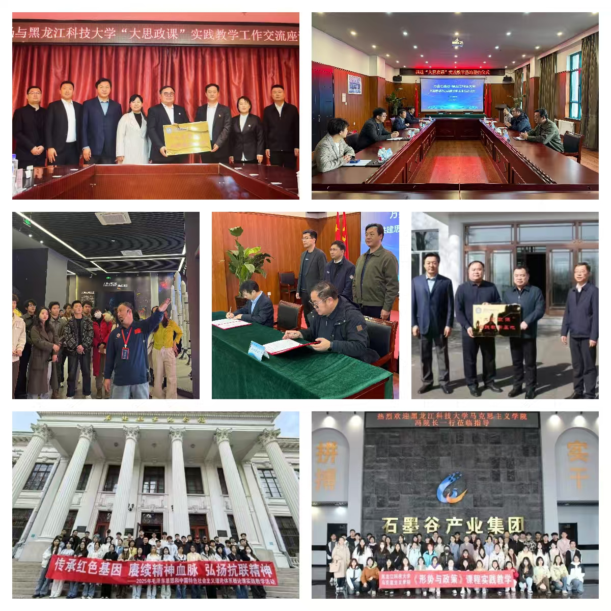 大思政课实践育人提质增效。学院依托《习近平新时代中国特色社会主义思想概论》等核心课程,先后与哈尔滨工业大学航天馆、哈尔滨万鑫石墨谷科技有限公司、鹤矿集团矿史馆、北大荒集团中国青年志愿垦荒纪念馆等单位合作开展大思政课实践教学,签署实践教学基地共建协议,共同开发优质教学资源,联合培养师资队伍,推动“大思政课”建设向纵深发展。