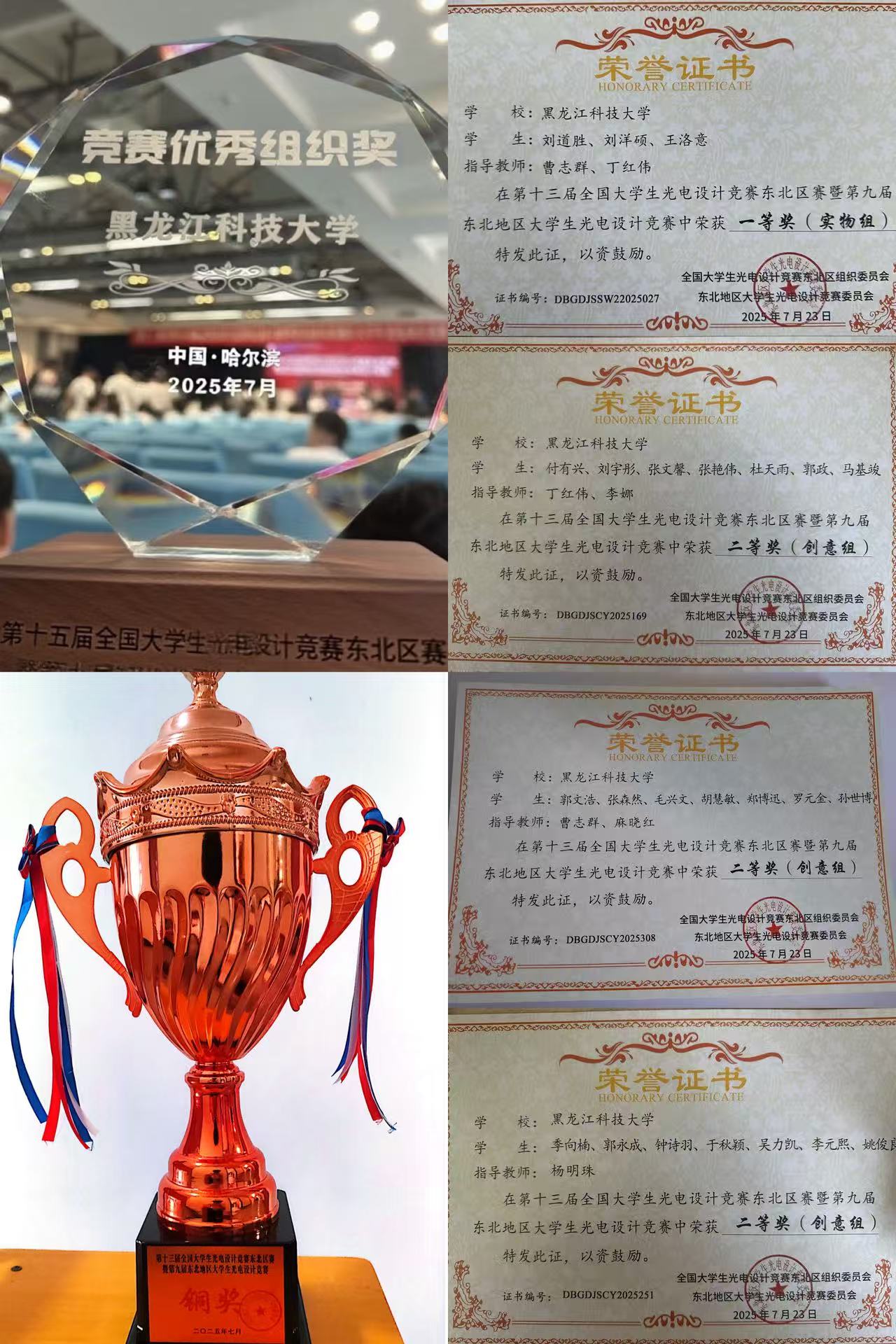 全国大学生光电设计竞赛是纳入教育部全国普通高校大学生学科竞赛排行榜(A类)的光电类专业顶级赛事。【官网】代表队在本次比赛中共荣获东北区一等奖23项,二等奖29项,同时学校还荣膺优秀组织奖第一名。在实物组赛道中,物理系丁红伟、曹志群老师指导的队伍以及王丰、曹志群老师指导的队伍,分别获得晋级国赛路演资格。此外,【官网】还有四支队伍获得晋级国赛推荐资格(国家三等奖)。在创意组赛道中,六支队伍获得东北区赛路演铜奖。