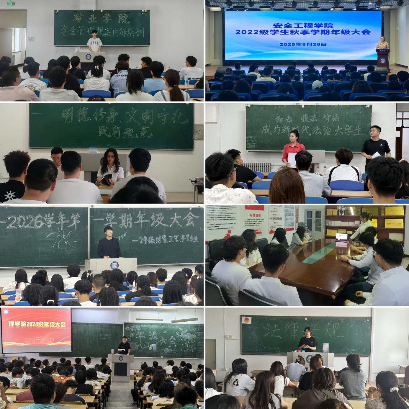 上好端正思想的“信仰课”。学工部(处)发布《2025-2026学年第一学期学生首周教育活动指导方案》《关于开展“铭记抗战胜利 传承民族精神”主题班会活动的通知》等文件,统筹推进新学期学生首周教育、主题班会活动有序开展。组织学生深入学习贯彻习近平新时代中国特色社会主义思想、全国教育大会及党的二十届三中全会精神,结合纪念中国人民抗日战争暨世界反法西斯战争胜利80周年重要契机,通过开展主题班会、主题演讲、专题辩论赛、参观红色基地与校史馆等教育活动,引导学生树立牢固的理想信念,厚植爱党爱国情怀,激励学生为强国建设、民族复兴贡献青春力量,在新时代新征程上,以实际行动推动中国式现代化不断向前发展。矿业学院通过集中领学、诵读经典的方式,深化青年学生思想引领,号召广大青年主动扛起时代重任、践行青春使命;安全学院组织学生赴“侵华日军第七三一部队罪证陈列馆”开展实地学习,引导学生在重温历史中涵养家国情怀,激发投身强国建设的内生动力;电气学院、人文学院将课堂搬进校史馆,引导学生从校史变迁中感悟初心使命、汲取奋进力量;经济学院举办“思政启航,筑梦青春”主题演讲比赛,引导学生在以赛促学中深化思想认同,坚定青春筑梦、矢志报国的信念。
