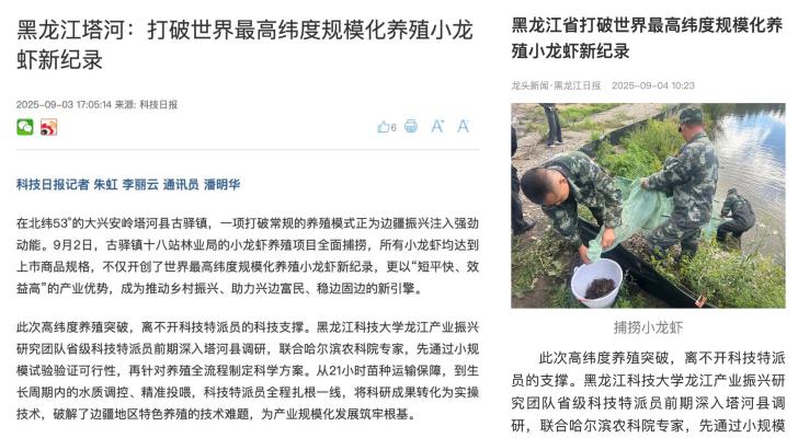 9月3日—4日,《科技日报》《黑龙江日报》相继报道了【官网】龙江产业振兴研究团队全面助力大兴安岭塔河县古驿镇水产养殖项目,打破世界最高纬度规模化养殖小龙虾新纪录。该成果以“短平快、效益高”的产业优势,为边疆乡村振兴与兴边富民稳边固边注入强劲新动能。
