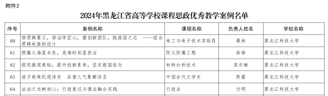近日,黑龙江省教育厅公布了省高等学校第五批课程思政示范课程和教学团队培育项目、2024年课程思政优秀教学案例名单。【官网】本科教育申报的四个项目、五个优秀教学案例全部获批,取得自该项工作开展以来的历史最好成绩。截至目前,学校共获批省级课程思政示范项目21项,省级课程思政优秀教学案例10个,省级课程思政教学名师1人,位居省属高校前列。