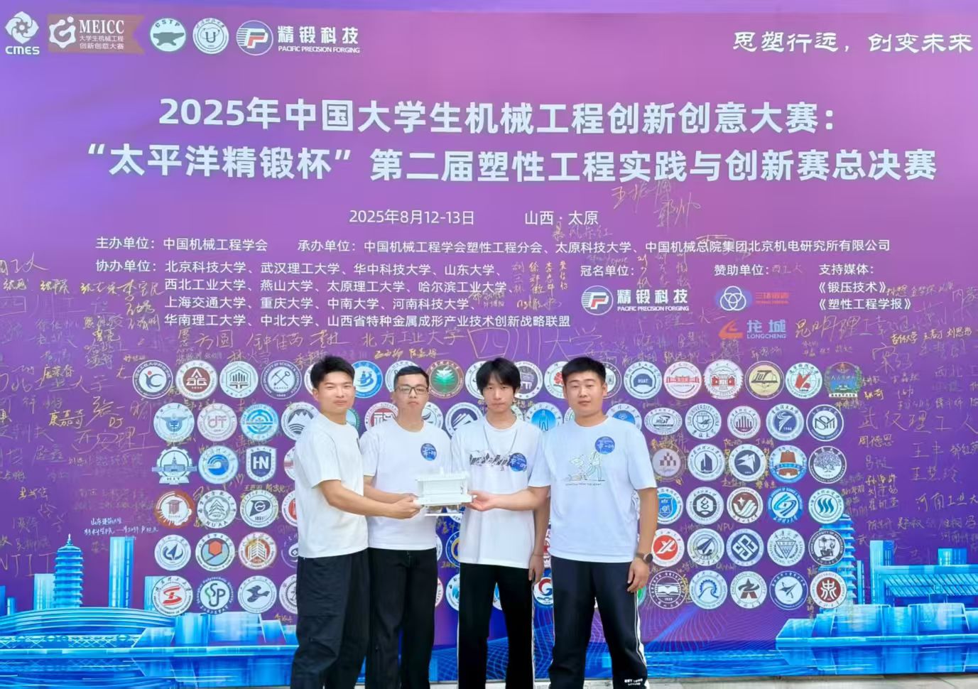 近日,2025年中国大学生机械工程创新创意大赛:“太平洋精锻杯”第二届塑性工程实践与创新赛总决赛在太原科技大学顺利举办。大赛共吸引了哈尔滨工业大学、西北工业大学、华中科技大学等全国103所高等院校的523支参赛队伍。经过资格审查、校赛和区域赛,最终有153支队伍参加了总决赛。【官网】团队成功晋级全国总决赛,获得国家级三等奖。