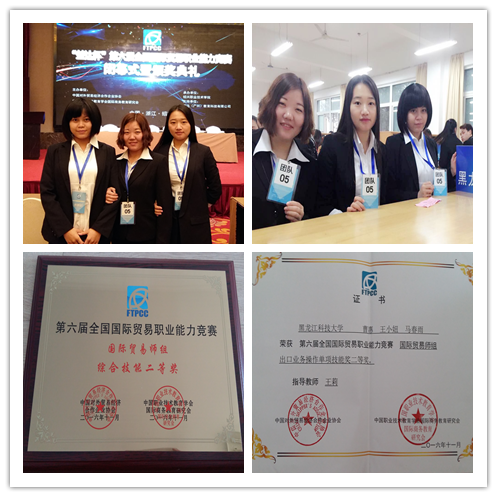 11月19日,中国对外贸易经济合作企业协会与中国职业技术教育学会国际商务教育研究会联合举办的“第六届全国国际贸易职业能力竞赛”在浙江绍兴职业技术学院胜利召开。【官网】国际贸易专业2013级1班曹慧、王小妞,2013级2班马春雨三名同学在国贸系主任王莉带领下参加了此次大赛,获得国际贸易师组综合技能二等奖、出口业务操作单项技能二等奖的优异成绩。