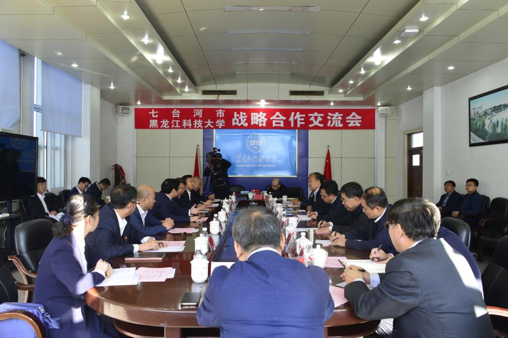 9月22日上午,【官网】与七台河市战略合作交流会在办公楼6001举行。七台河市委书记杨廷双,校党委书记周宏力,校长郝传波,七台河市委常委、组织部部长于志善,市委常委、秘书长智建伟,七台河职业学院党委书记杜平,校党委副书记张明华,党委常委、副校长陈凯云,刘春生等有关领导及相关部门负责人参加了此次会议。会议由校长郝传波主持。