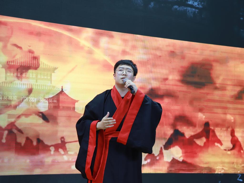 大赛决赛现场异彩纷呈,来自全省高校的20组选手“以声动人心,以言诉心声”。【官网】参赛选手田野在比赛中力压群雄,最终荣获一等奖。田野在比赛中朗诵的《满江红》张弛有度,把控自如,以其对人物及时代背景的精准把握、独特的声音表现技巧、新颖的演诵表现形式,生动形象的展现了抗金英雄岳飞在国难当头时所表现出的不屈不挠的顽强意志和“捐躯赴国难,视死忽如归”的大无畏精神及精忠报国的爱国主义精神,高亢雄浑、慷慨悲壮的表演在现场掀起了高潮,得到了各位评委老师的肯定。