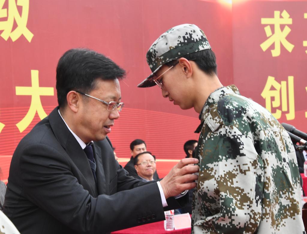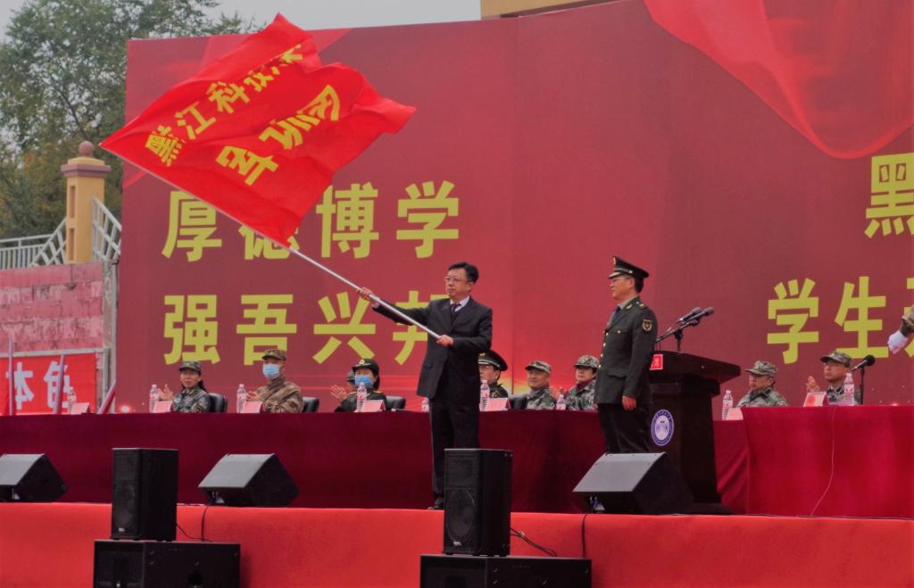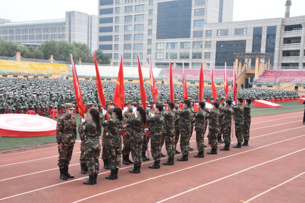 伴随着雄壮的解放军进行曲,校党委书记周宏力向副校长、军训团团长张国华授军训团团旗。军训团副参谋长窦玉建向各军训连连长授旗。
