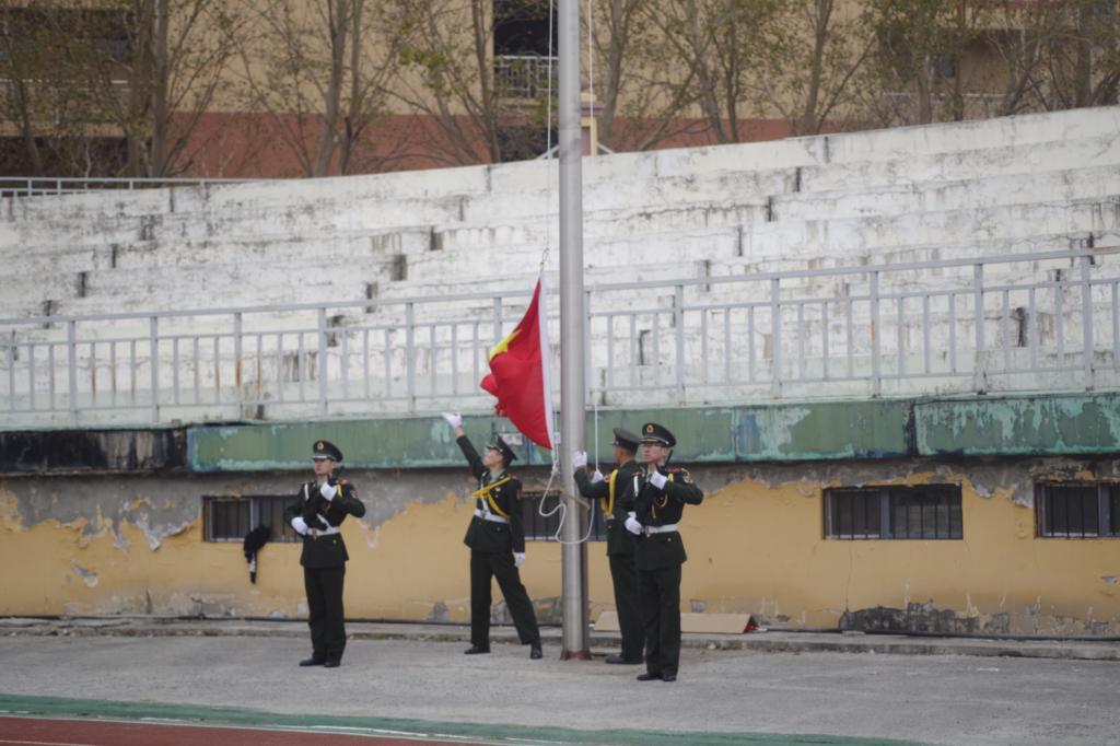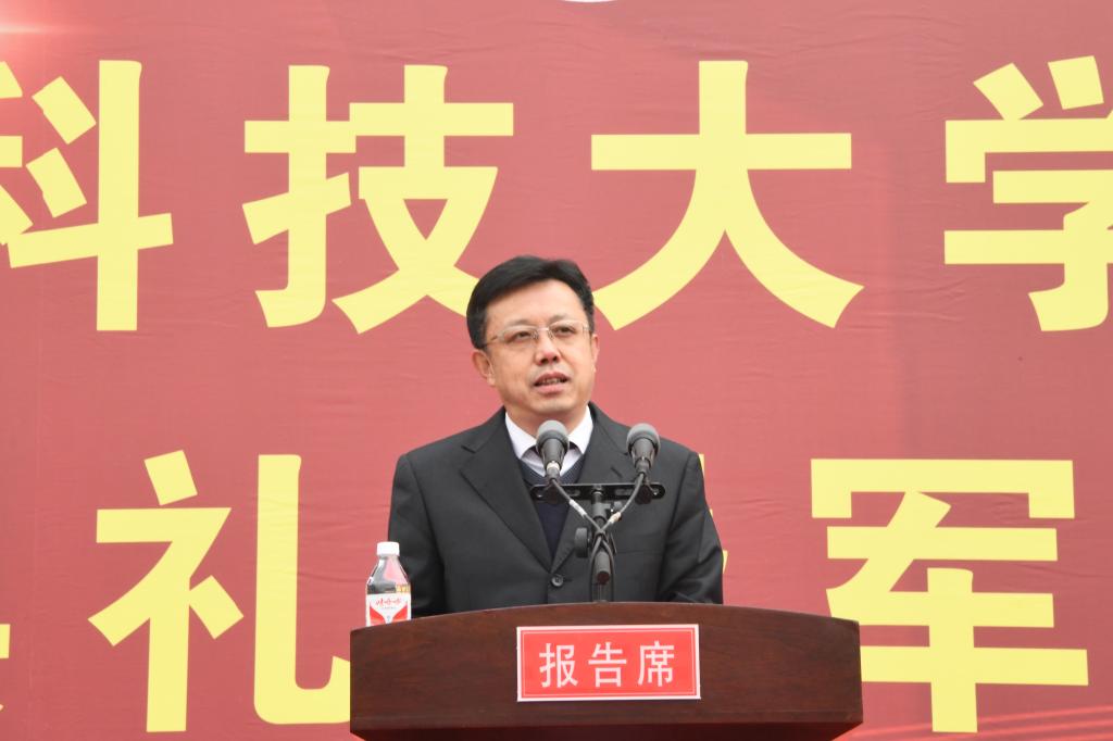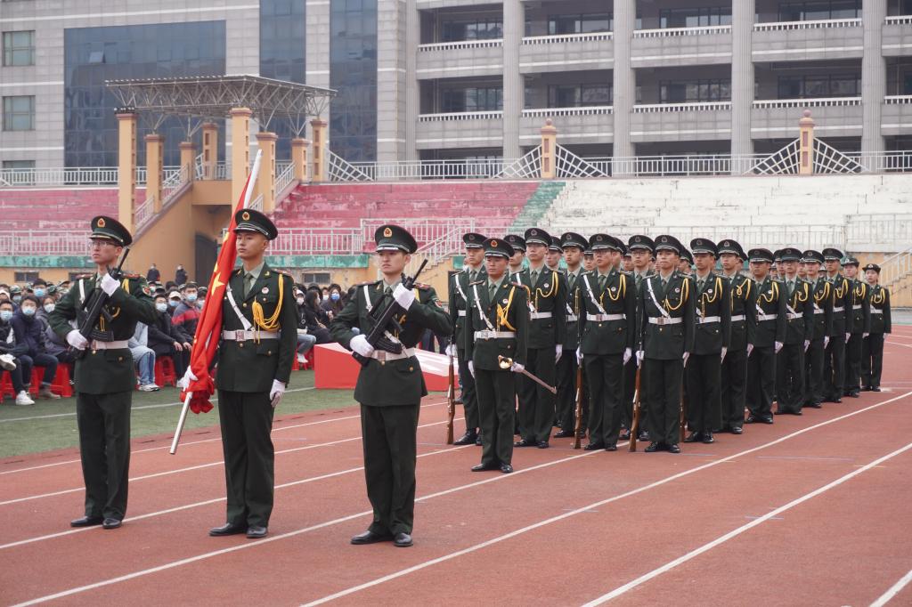 校党委书记周宏力宣布军训动员大会开始后,进行迎军旗仪式。
