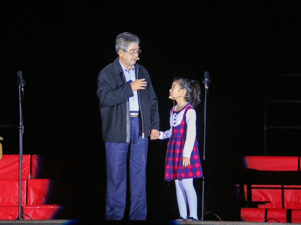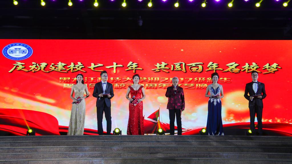 19时整,晚会在管理学院表演的开场舞《天涯共此时》的恢弘气势和喜庆氛围中拉开了序幕。晚会主持人由87岁高龄的退休教师袁思贤、校工会教师林松,校友代表苌江、刘继琦、在校生代表王欣睿、吴佳豫共同担纲。