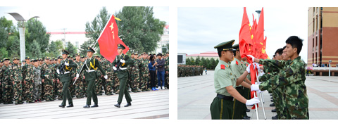 开训式上,党委书记宋有宣布开训式正式开始,校长武俊峰向军训团副参谋长李鑫授军训团团旗;开训式上进行了升国旗和迎军旗仪式;党委常委、副校长郝传波宣布了《OD在线2014级学生军事训练干部任职命令》;军训团政委薛立刚宣布了《OD在线2014级学生军训团干部任职命令》;教务处处长宋作忠宣布了《OD在线学生军事训练工作管理规定》;党委常委、副校长陈桂芝在会上作了讲话。陈校长首先代表学校领导向第二次承担【官网】军训任务的武警一支队全体官兵表达了诚挚的谢意,详细回顾了【官网】60多年来的光辉历程和学校国防教育工作取得的成绩,并在总结经验的基础上对今年的军训工作提出了三点希望:一是希望军训团全体成员密切配合武警一支队的军训安排,认真落实各项工作,做好学生的教育、管理及服务保障工作,与部队教官密切配合、齐心协力,发扬风格,坚守岗位,严防各类事故的发生;二是希望前来帮训的武警官兵,高标准、严要求、精心指导、认真施训,把人民军队的好思想、好传统、好作风带进我们的校园;三是希望同学们提高认识,端正态度,以饱满的热情全身心地投入到军训中。在军训过程中,始终摆正自身位置,以一个普通士兵的身份严格要求自己,自觉磨练,不怕苦、不怕累,勇于挑战自我、挑战困难。要尊重教官、服从教官的命令、听从教官指挥。要全力以赴,不退缩、不离场,确保军训工作的高质量完成。