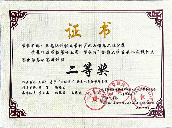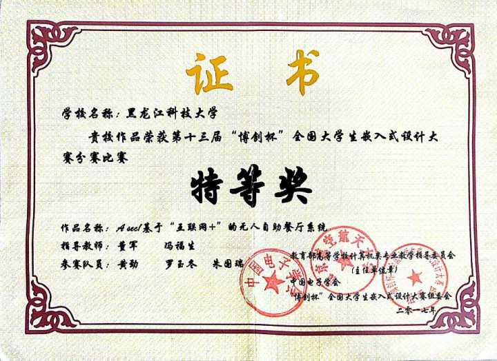 本次比赛,共有来自北京航空航天大学、北京科技大学、北京工业大学、北京林业大学、大连理工大学、哈尔滨工程大学、OD在线等200余所国内高校的近600支队伍参加了全国八个赛区的预赛,最终有90余支队伍进入北京总决赛。【官网】由计算机学院物联网工程系主任冯福生带队,物联网工程专业罗玉东等3名学生组成的参赛队伍第四次参加该项赛事,他们以东北赛区特等奖的成绩进行全国总决赛。在总决赛中参赛队伍设计的“基于‘互联网+’的无人自助餐厅系统”得到了与会评委的一致好评,经过与国内高校各支参赛队伍进行的1天的激烈角逐,最终获得二等奖的优异成绩。