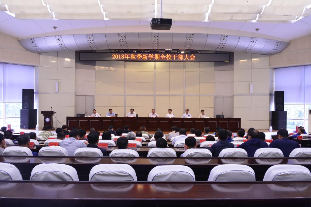 9月4日下午,【官网】在办公楼报告厅召开了2018年秋季新学期全校干部大会。校领导,校本部副处级以上干部,嵩山校区、双创中心、煤研所党政主要负责人参加了会议。会议由校党委副书记张明华主持。