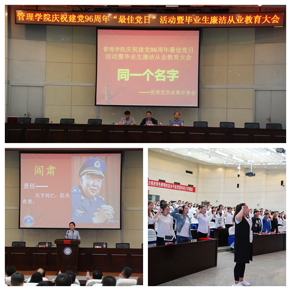 6月20日上午,管理学院党委在报告厅举办了庆祝建党96周年“最佳党日”活动暨毕业生廉洁从业教育大会。校党委副书记陈桂芝,校党委常委、组织部部长陈玉平、管理学院党委书记王洪秋,学生党支部书记、13级毕业生党员参加了会议。