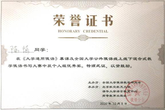 12月7日由全国大学俄语教学研究会、北京航空航天大学《大学通用俄语》慕课团队、清华大学语言中心、高等教育出版社联合举办的《大学通用俄语》慕课及全国大学公外俄语线上线下混合式教学俄语书写大赛圆满落幕。在本届大赛中,【官网】国际教育学院俄语专业同学分获二等奖3项、三等奖2项、优秀奖5项。